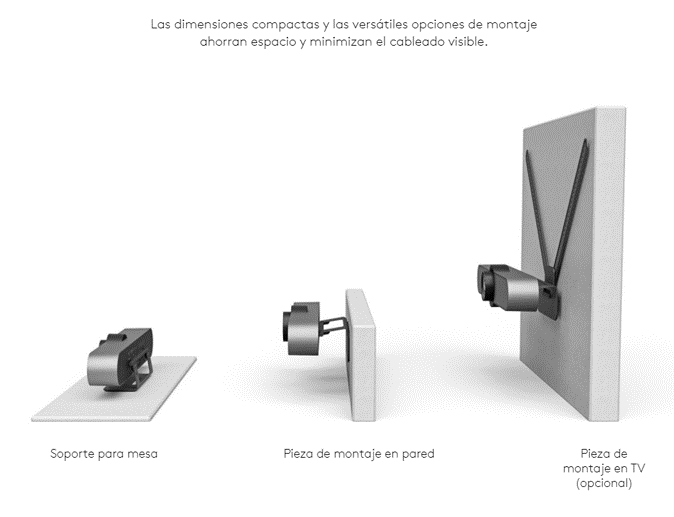 Soporte integrado para mesa/pared; disponible pieza de montaje en TV opcional